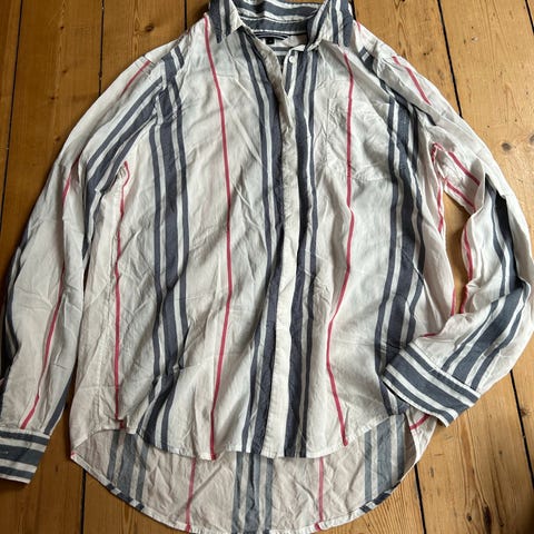 Gul skjorte af silke. Med lille rudemønster i hvid og sort. Med B-udskæring og uden krave. Lange ærmer. Str. medium.