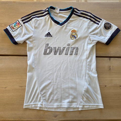 Sælger en original Real Madrid hjemmebanetrøje i børnestørrelse (128 cm / ca. 8 år) fra den ikoniske 2003/04-sæson, hvor stjerner som Zidane, Ronaldo, Raúl og Beckham tørnede ud for Los Blancos.