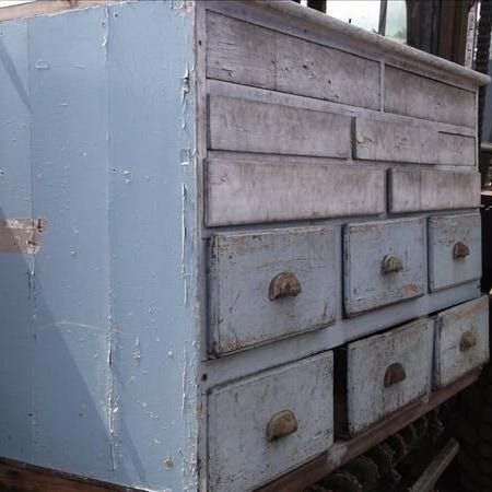 Gammel disk fra omkring år 1880 - 1910 som har stået på et apotek i Kolding i mange år, derfor er en del af skufferne endelt i mindre rum.