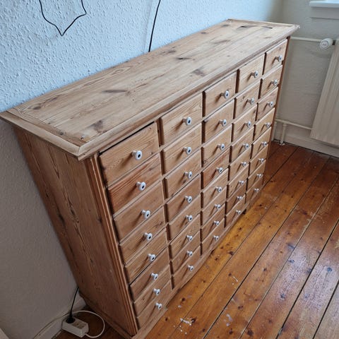 Gammel disk fra omkring år 1880 - 1910 har stået mange år på et apotek i Kolding, og derfor er en del af skufferne indelt i mindre rum, hvis du vil se nærmere på denne disk er du velkommen, jeg bor i Nørresundby og prisen er ikke til forhandling.