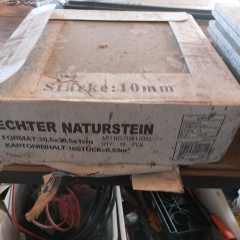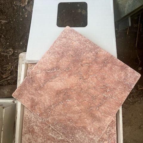 Rest fra byggeprojekt: kantklinker travertin, 400 mm lange, 80 mm høje, 12 mm tykke. 22 bundter med 10 stk, - ialt 88 meter. En dunk afsyring og en dunk overfladebehandling kan medfølge. Alt importeret fra fransk specialforretning. Kan sendes med fragtmand for købers regning.
