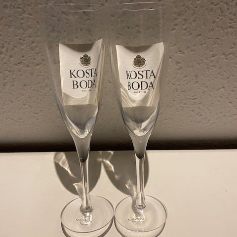 9 eksklusive champagneglas (fløjter). De er fremstillet I fint krystal på det hæderkronede svenske glasværk Kosta. Det blev grundlagt 1742 i Småland og blev langt senere fusioneret med Boda til Kosta Boda. Glassene er I Art Deco stil og er fra 1930'erne. De står på en 4kantet fod med afskårne hjørner. Højden er 11,5 og kummens diameter er 6 cm øverst. De er alle 9 i perfekt stand uden skader. Sælges kun samlet. Står på Mols men kan gratis leveres I Aarhus og Ebeltoft eller sendes billigt på købers regning