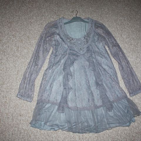 Flot fintrikket grå kjole med en fin foldedetalje over hals og skulder. Skal ses på.