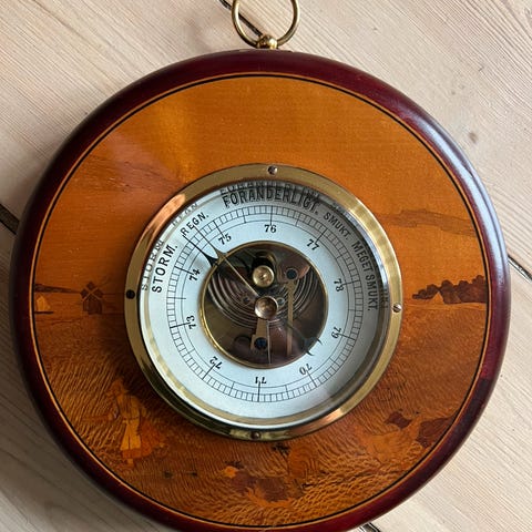 Gammel fin vejrstation, barometer og termometer i udskåret træ.