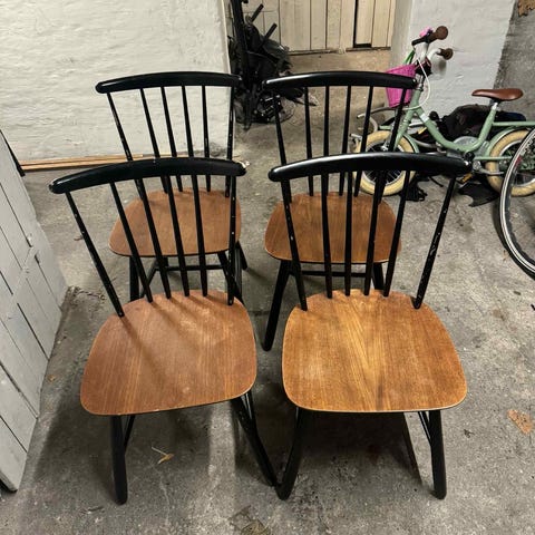 4 fede Retro stole, som muligvis kommer fra et gammelt klasseværelse. Jeg har selv købt dem brugt, men har aldrig brugt dem selv.