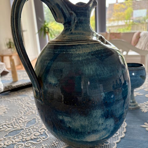 Fadet er glaseret i smukke blå og grønne nuancer med stiliserede blade.