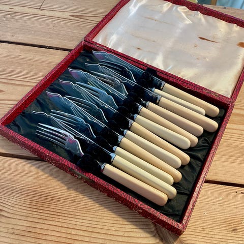 Smukt og klassisk sæt fiskebestik bestående af 6 knive og 6 gafler fra det anerkendte britiske mærke Walker & Hall, Sheffield. Købt på et antikmarked i Dublin i 2005.