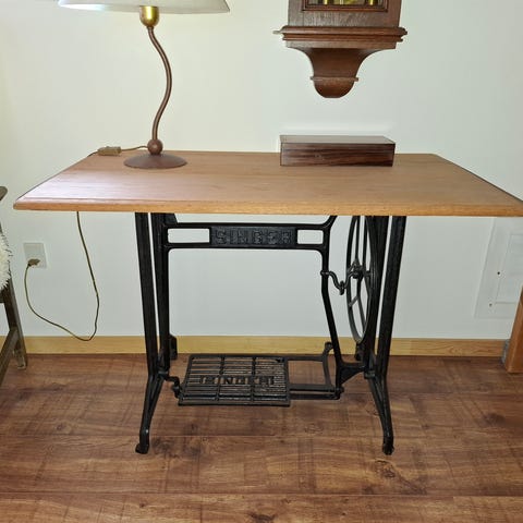 86 lang 46 bred og 77 høj. I fin stand. Der kan sættes en Singer i