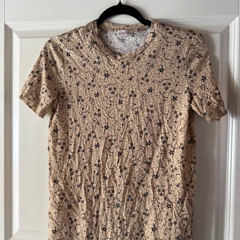 Næsten ny t-shirt i hvid med sort print i str. S. Brugt sparsomt.
