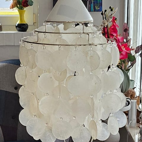 2 hængelamper lavet af muslingeskaller, virker ok, pris pr stk.