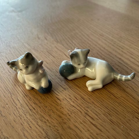 Smuk samling af 5 originale porcelænskatte fra Metzler & Ortloff, Ilmenau, Tyskland (ca. 1950–1970). Figurerne forestiller legende killinger med garnnøgler – i delikat glaseret porcelæn med fine, håndmalede detaljer.