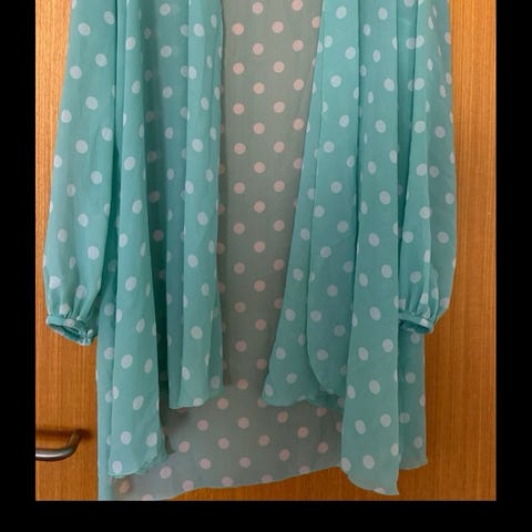 Transparent cardigan i Tyrkiet blå / grøn med hvide polkaprikker, blågrøbt som det græske hav