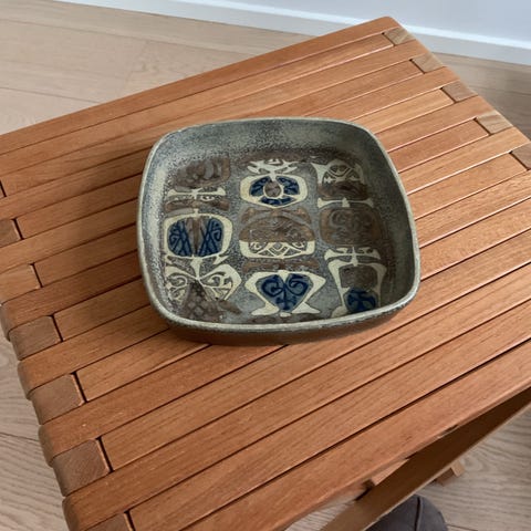 Firkantet fajanceskål med blå dekoration, fremstillet af Royal Copenhagen som del af deres populære Baca-serie. Mål: 17 × 17 × 3,2 cm. Klassificeret som 3. sortering, men fremstår i pæn stand uden synlige afslag eller misfarvninger.