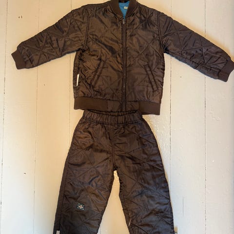 Thermo sæt i fin stand. En syning er gået lidt på bukser se billede, ikke forsøgt lavet. Har en gummioverflade så er lidt vand afvisende. Lækkert blødt sæt. Str 86.