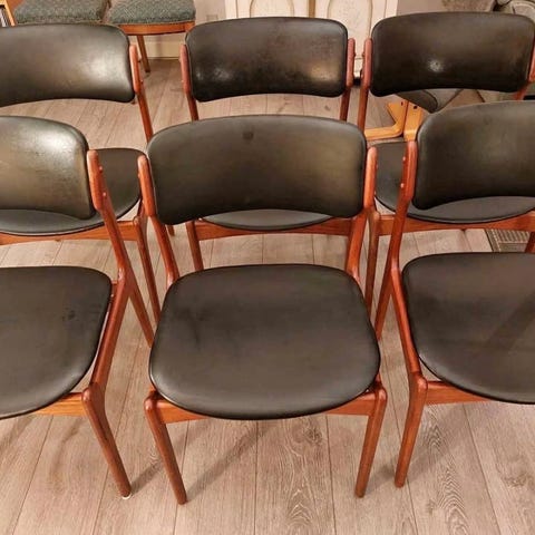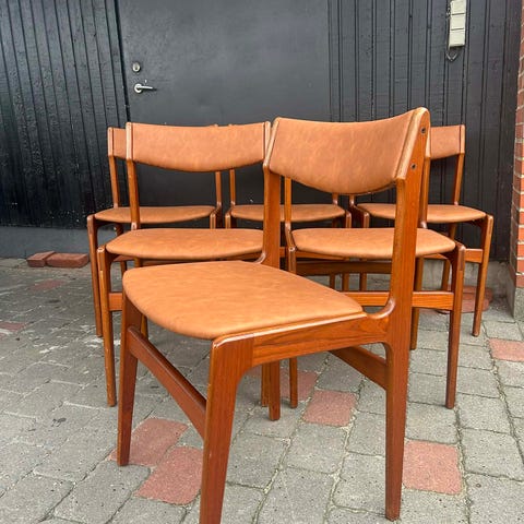 Sæt af fire spisestuestole i teak og grøn polstring designet af Erik Buck fra 1960erne. Fremstillet hos O.D møbler.