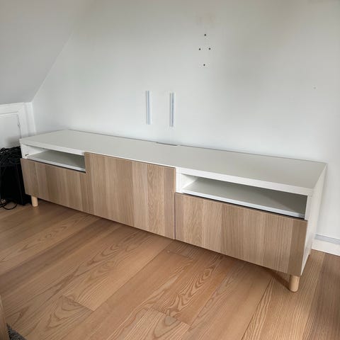 2 rummelige skuffer der fungerer uden problemer. Måler ca: 52 x 38,5 x 24 cm. Hylde i midten der inddeler i 2 rum. Robust og kan tåle man sidder på det.
