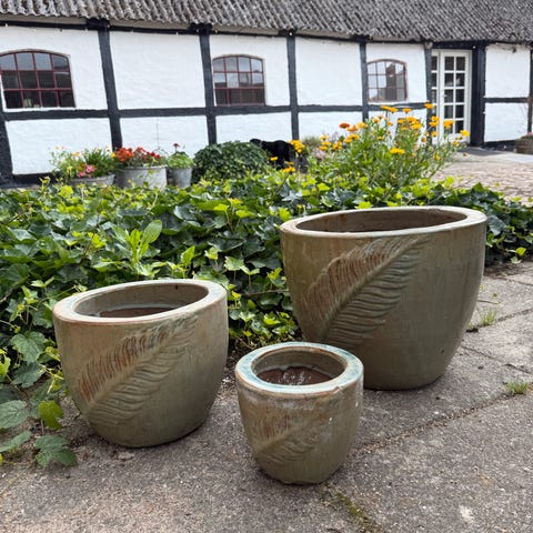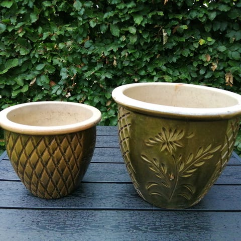 Masser af forskellige brugte glaserede lerkrukker med og uden hul i bund. Pris fra 25 - 100 kr. Rabat ved flere...
