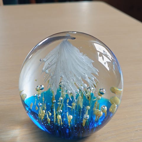 Brevpresser af ældre dato i glas. Den måler 24 cm i omkreds. Ingen hak eller afslag. Er i Vanløse. Skal afhentes, er temmelig tung.