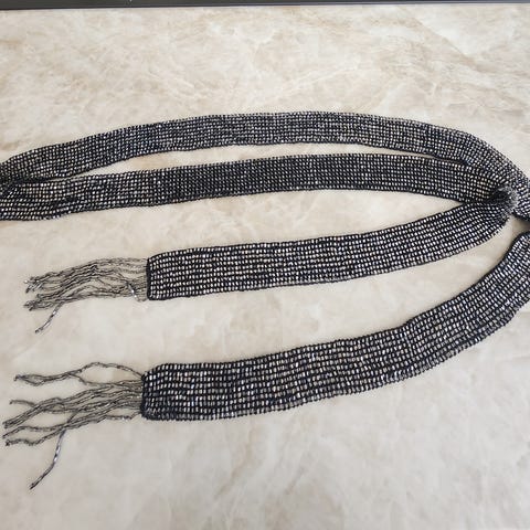 Bælte, Perlebroderet bælte , Andet, str. 150 cm, Gråt, Uld, bomuld , Næsten som ny, Perlebroderet polstret bælte (88 cm) med bindebånd (31 cm) i hver ende. I alt 150 cm langt. Bredde: 4,5 cm. Håndarbejde.