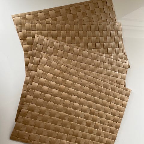 Dækkeserviet, Et par rektangulære dækkeservietter i MDF og kork med lamineret, grafisk tryk foran. Samlet 49 kr. Bordskåner spiseunderlag med sort/hvidt mønster med geparder. Den ene har to svage lyse mærker efter kaffekop se det sidste foto.