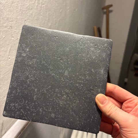 Der sidder lidt løs fuge eller klæber på nogle af fliserne, så en afrensning og eventuelt tur i opvaskemaskinen er nødvendig før montage.