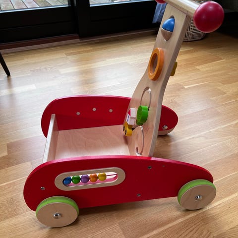Stabil og godt kørende gåvogn fra Hape i flotte farver. I træ og med sjovt legetøj på siderne.