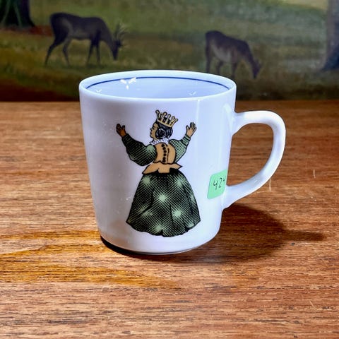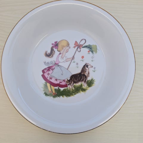 Kahla retro kop med underkop til børn fra slutningen af 70'erne eller starten af 80'erne. Porcelænssæt produceret af Kahla i det daværende Østtyskland til det norske marked, med indskriften "flink pike". Motivet er hentet fra det engelske børnerim "Little Bo-Peep".