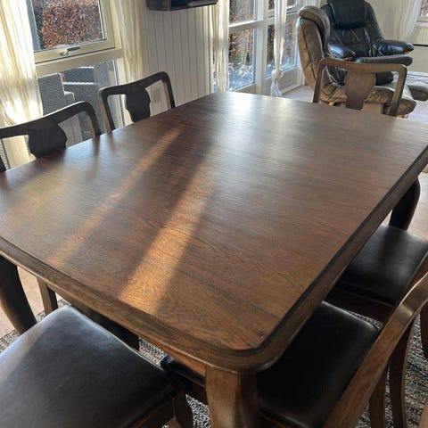 Vi sælger et sæt (kan også købes hver for sig) bestående af seks flotte stole og et solidt spisebord. Bordet er velbrugt, men stadig stabilt og funktionelt. Resten af sættet er i rigtig god stand.