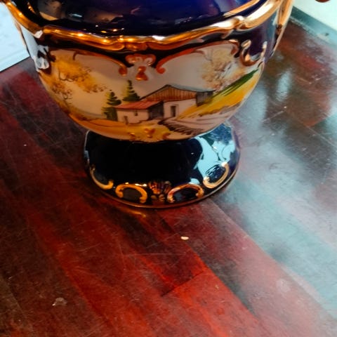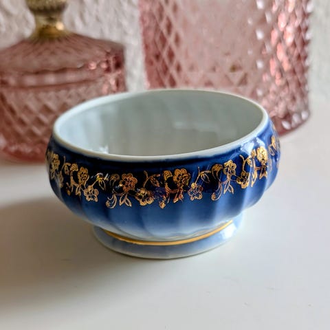 Blå Portugal skål med låg er lift slidt på øren der gået lidt af guld belægning af der er foto af det