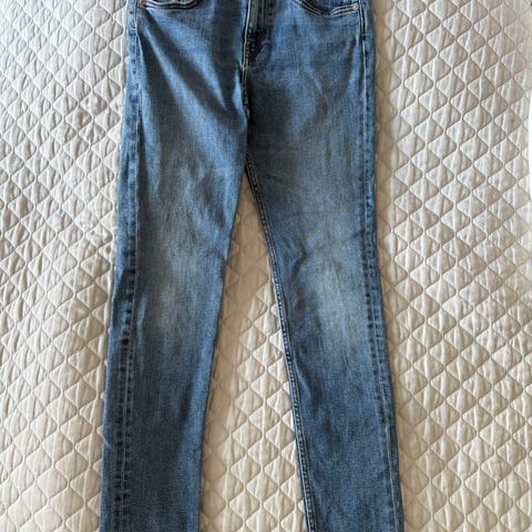 Lyseblå forvaskede jeans med vidde ben. Livvidde 86cm.