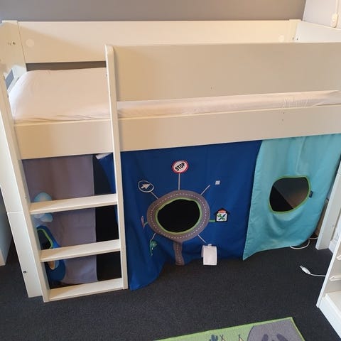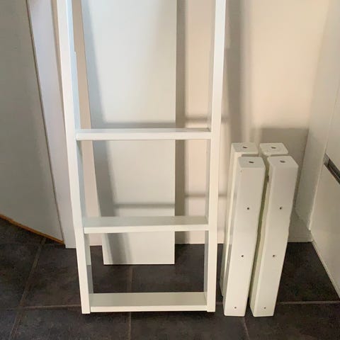 Hvid Manis-h sengestige og 51 cm ben til halvhøj seng. Med 2 gavl hylder i hvid.