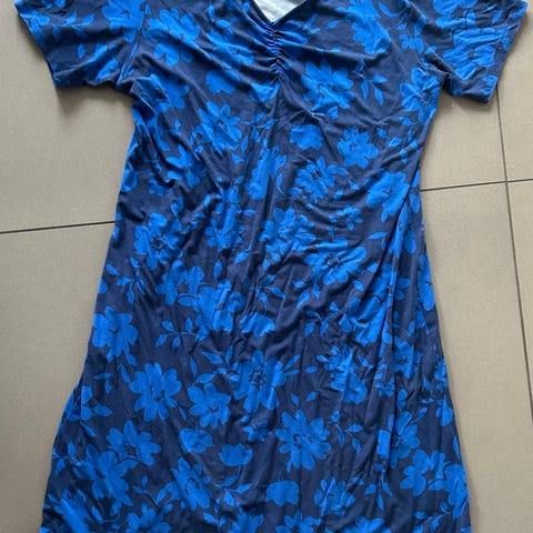Kjolen er i str. L, lukkes med lynlås i ryggen og med korte ærmer.