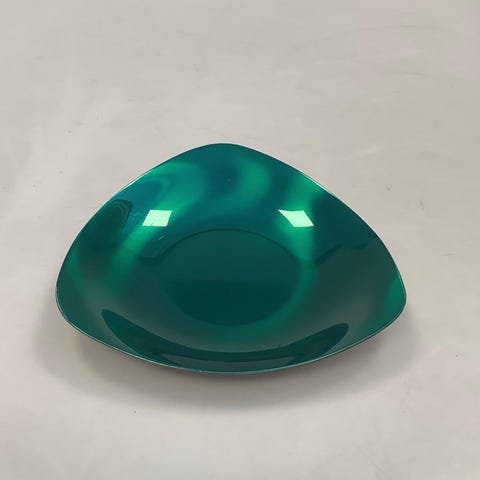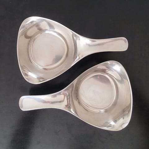 Tre stilrene serveringsskåle i rustfrit stål fra 1950'erne. Design Aage Helbig Hansen for Dansk Forsølvningsanstalt, DFA. Med DANA serienummer fra fabrikken på mærkat under bunden.