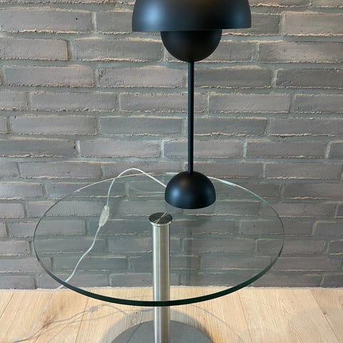 Fint glasbord ned hylde i glas i god stand. Designer Finn Østergaard (att.) fra 70 Erne.