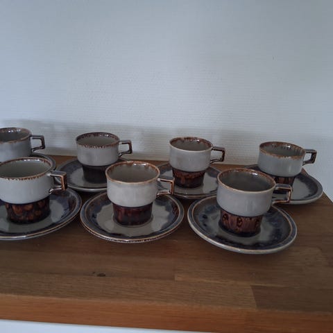 6 par kaffekopper , med kagetallerkener.