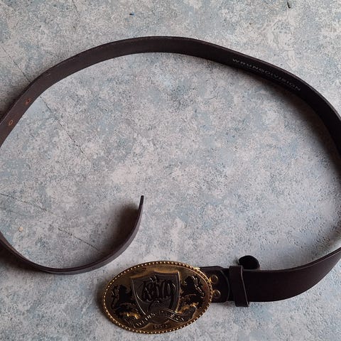 Vintage Wrangler Blue Bell Champion Cowboy Bæltespænde. Måler 9 x 5 cm er uden læderrem og mangler en hæftetap på bagsiden, hvilket betyder, det skal repareres eller kan bruges som samleobjekt eller dekoration.