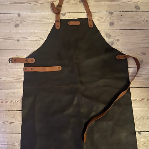 Bon Goût læderforklæde i ægte kalve læder. Forklædet har 2 læderremme i højreside til evt. viskestykke, grilltang mm. og en Sidelomme med målene 22 x 16 cm