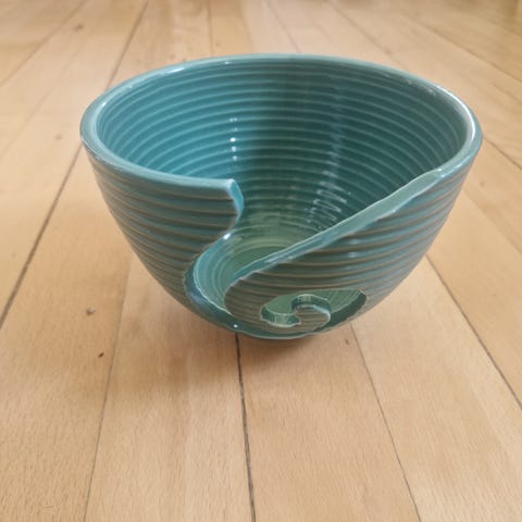 Keramikkop med fin glasur på indersiden og tekst på ydersiden “If I can’t bring my yarn I’m not coming” og et garnnøgle med strikkepinde.