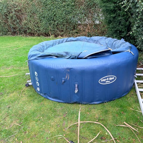 Lay-Z “Miami” oppustelig spa med tilhørende pumpe. God, men brugt: enkelte huller, lappet med succes’s. Medfølger almindeligt låg.