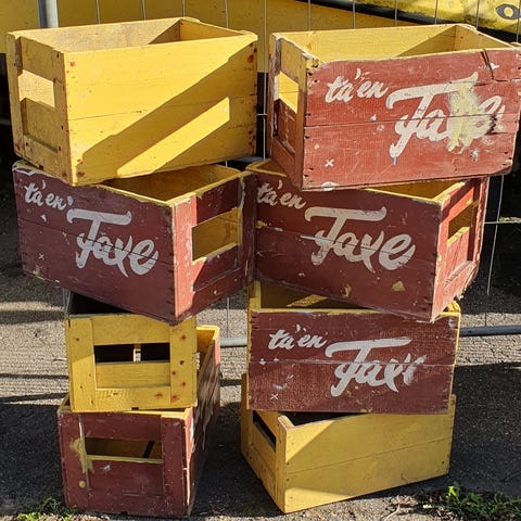 Faxe trækasser, malede. Har været brugt til malerbøtter.