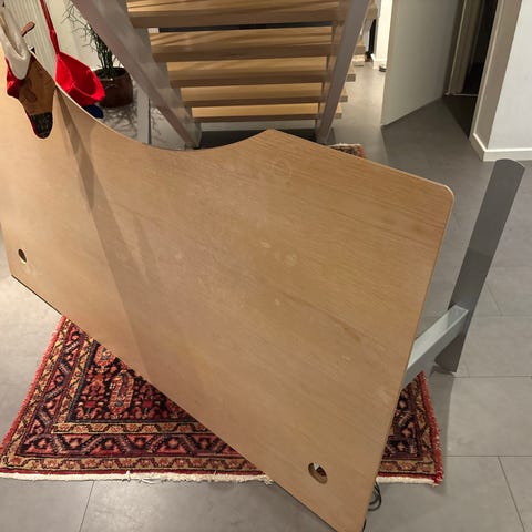 Stort massivt skrivebord der er manuelt justerbart i højden, 67cm-87cm, 110dybt venstre, 80dybt højre, lækkert bord fineret med ægte kirsebærtræ finer, så kan slibes og lakeres, med hylde under bordpladen til kabler stikddåser og andet, adskildt for nemmere transport.