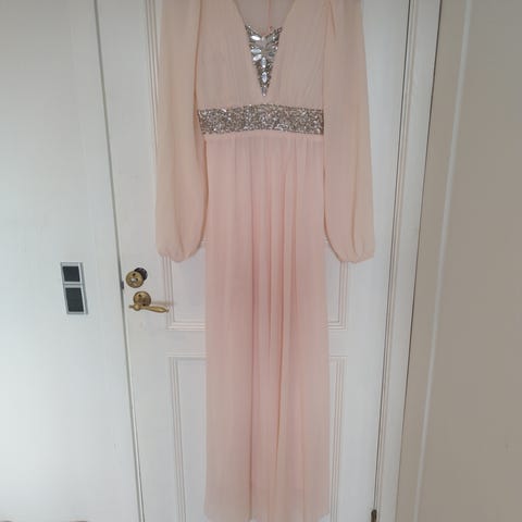 Navy maxi kjole med blonde ved toppen og halen. Kjolen er stropløs og man kan se gennem blonden på ryggen.