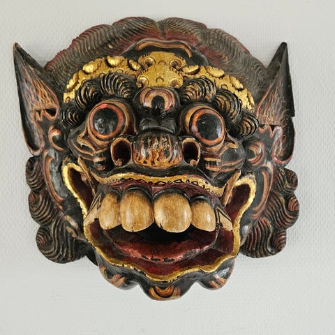 Indonesisk etnografika: Gammel Barong maske fra Java/Bali. Håndskåret i træ. Højde 21 cm., bredde 20 cm., længde 46 cm. Sender gerne.