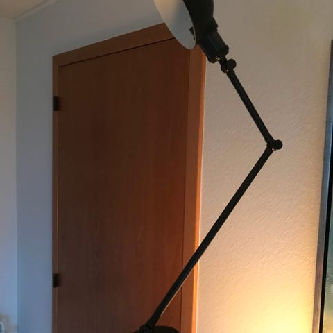 Lampen kan bruges som både loft- og væglampe og har et skulpturelt, industrielt udtryk med justerbar arm – perfekt til køkken, entre eller kontor.