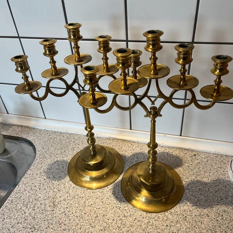 Jeg har en masse lysestager I messing og i sæt og så har jeg et sæt med fem arme på hver og en enkel der også har fem arme men den har ikke en makker og så er der et par i rød marmor også i sæt