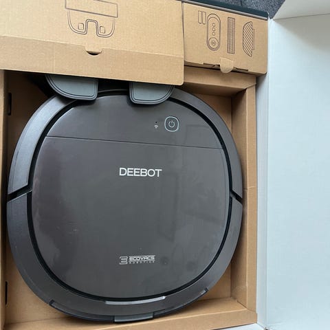 Ecovacs Deebot robotstøvsuger i sort farve. Denne model er designet til effektiv rengøring med automatisk funktion. Den er udstyret med en aftagelig støvbeholder og en opladningsstation. Ideel til daglig rengøring af hjemmet.