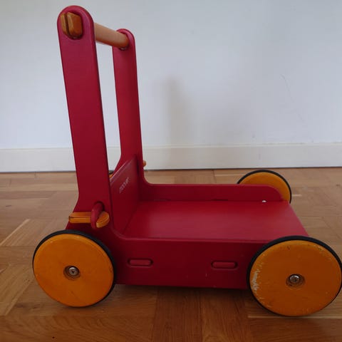 Moover gåvogn i super god stand. Tyngdepunktet gør, at den er ideel for babyer til selv at trille med den, når de skal lære at gå. Vores gik da han var 9mdr :-)
