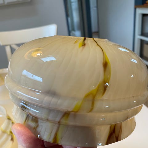 Vi sælger 6 mini lampeskærme til lysekrone. De er helt nye og ubrugte og ligger stadigvæk i deres plast emballage. Farven er mild gylden og stoffet indeni er creme. Meget flotte og behagelige lampeskærme. Sælges sammen og vi tager kun kontanter