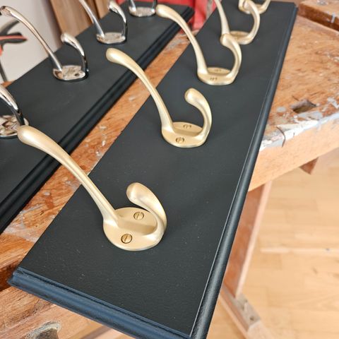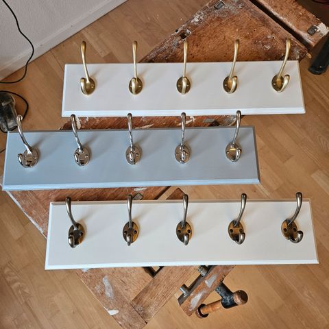 Smukke estetiske knagerækker med fine fræset kanter, i enten hvid beige og grå kan laves i andre pastel farver eller sort efter bestilling. Med lære massive knager enten i blank krom, rustfrit stål, blank messing ,antik messing eller børstet messing.