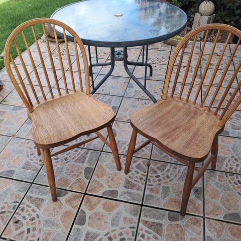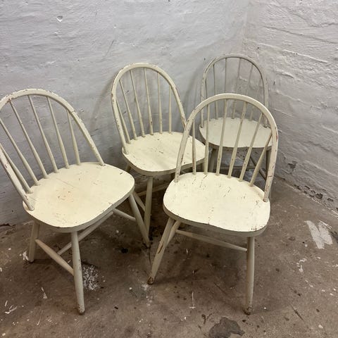 Klassisk gamle Windsor stole af massiv egetræ med udskæringer t ryggen.